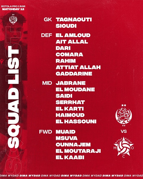 أعلن التونسي فوزي البنزرتي، مدرب الوداد البيضاوي عن لائحة الفريق الأحمر ، في مباراة الليلة على ملعب محمد الخامس بالدار البيضاء أمام مولودية وجدة، والمقدمة عن الجولة 12، و شملت هذه اللائحة 20 لاعبا، و عرفت غياب أغلب اللاعبين الذين خاضو مباراة كايزر تشيفز.