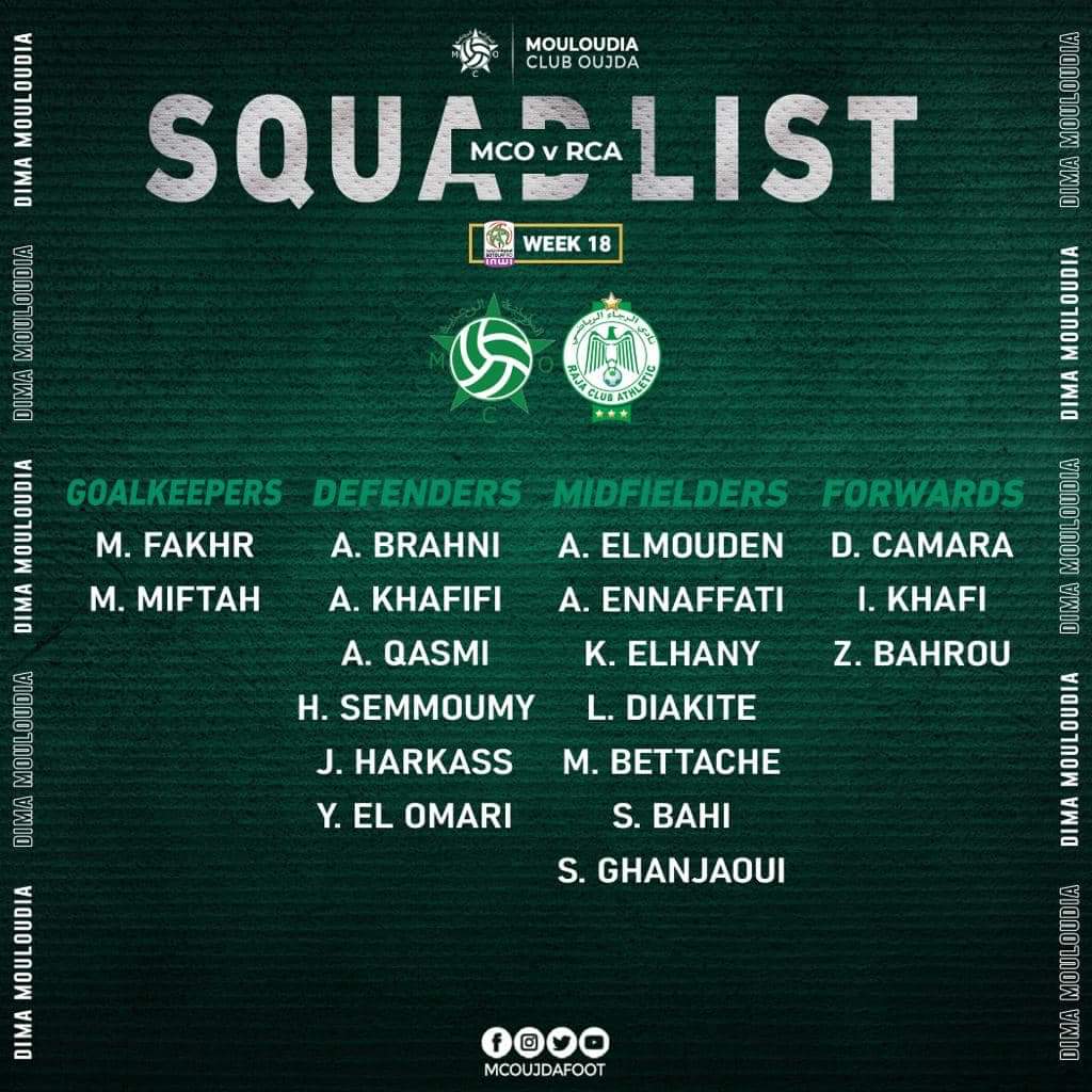 أعلن الطاقم التقني لفريق مولودية وجدة لكرة القدم، عن لائحة اللاعبين التي وجهت لهم الدعوة لخوض مباراة الجولة 18 من منافسات الدوري الاحترافي، أمام ضيفه الرجاء الرياضي مساء اليوم الخميس، وجاءت لائحة الفريق كالتالي :