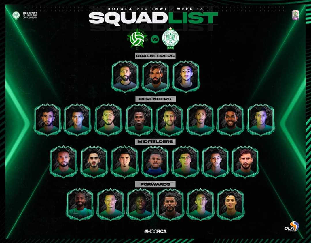أعلن الطاقم التقني لفريق الرجاء الرياضي لكرة القدم بقيادة المدرب التونسي الأسعد الشابي، عن لائحة اللاعبين الذين استدعاهم لخوض مباراة الجولة 18 من منافسات الدوري الاحترافي أمام مولودية وجدة مساء اليوم الخميس، وهي كما يلي: