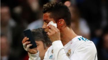 حرص اللاعب البرتغالي كريستيانو رونالدو على استعارة هاتف أحد أعضاء الطاقم الطبي لفريقه لتفقد حجم الإصابة التي تعرض لها في وجهه خلال مباراة فريقه أمام ديبورتيفو لاكرونا في الدوري الإسباني لكرة القدم.