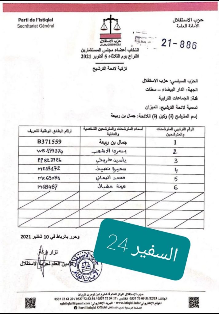 وأودع المستشار البرلماني جمال بنربيعة لدى السلطات المسؤولة ترشيحه من أجل التنافس على مقعد برلماني لولاية جديدة، إذ يعتبر الأكثر حظا من أجل تمثيل حزب الميزان بمجلس المستشارين عن صنف الجماعات المحلية.