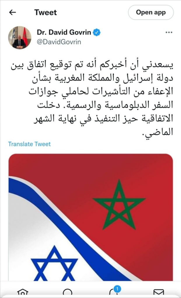 ونشر غوفرين تغريدة على حسابه تويتر” يسعدني أن أخبركم أنه تم توقيع اتفاق بين دولة إسرائيل والمملكة المغربية بشأن الإعفاء من التأشيرات لحاملي جوازات السفر الدبلوماسية والرسمية”.