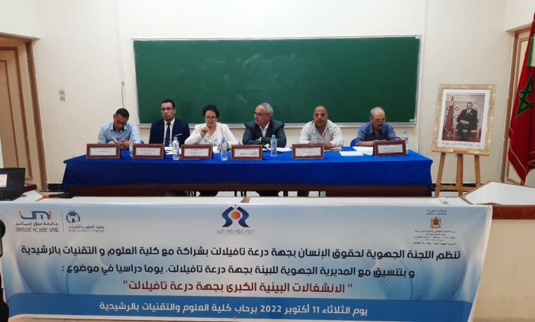 التأمت مجموعة من الفعاليات الإدارية والمدنية والأكاديمية العاملة والنشيطة في مجال البيئة بكلية العلوم والتقنيات بالرشيدية، لتدارس الانشغالات البيئية الكبرى لجهة درعة تافيلالت، في إطار اليوم الدراسي الذي أشرف على تنظيمه كل من اللجنة الجهوية لحقوق الانسان لجهة درعة تافيلالت، كلية العلوم والتقنيات بالرشيدية والمديرية الجهوية لقطاع البيئة، وذلك تنزيلا لاتفاقية الشراكة المبرمة بين اللجنة الجهوية لحقوق الانسان وجامعة مولاي إسماعيل بمكناس، وتفعيلا للبرنامج السنوي برسم سنة 2022 لذات اللجنة، وتماشيا مع توجهات عمادة كلية العلوم والتقنيات بالرشيدية الرامية أساس إلى انفتاحها على محيطها السوسيو اقتصادي والثقافي باعتبار الجامعة فضاء لإذكاء الحوار والنقاش العلمي الهادئ في الانشغالات المجتمعية الكبرى أبرزها موضوع البيئة الذي يحظى باهتمام بالغ من قبل صاحب الجلالة الملك محمد السادس نصره الله وأيده، وتوليه الحكومة كامل العناية خاصة خلال السنوات الأخيرة مع بروز عدة مشاكل بيئية تهدد أمن وسلامة المواطنين.