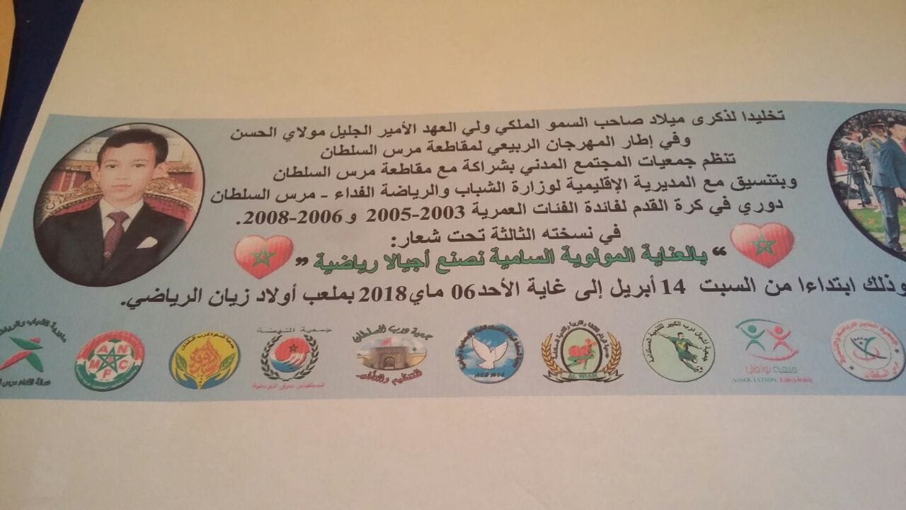 تحت شعار “بالعناية المولوية السامية نصنع أجيالا رياضية”، وتخليدا لذكر ميلاد صاحب السمو الملكي ولي العهد الأمير الجليل مولاي الحسن، وفي اطار المهرجان الربيعي لمقاطعة مرس السلطان، تنظم جمعيات المجتمع المدني بشراكة مع مقاطعة مرس السلطان، وبتنسيق مع المديرية الاقليمية لوزارة الشباب والرياضة الفداء – مرس السلطان، الدورة الثالثة لدوري في كرة القدم لفائدة الفئات العمرية 2003- 2005 و 2006-2008.