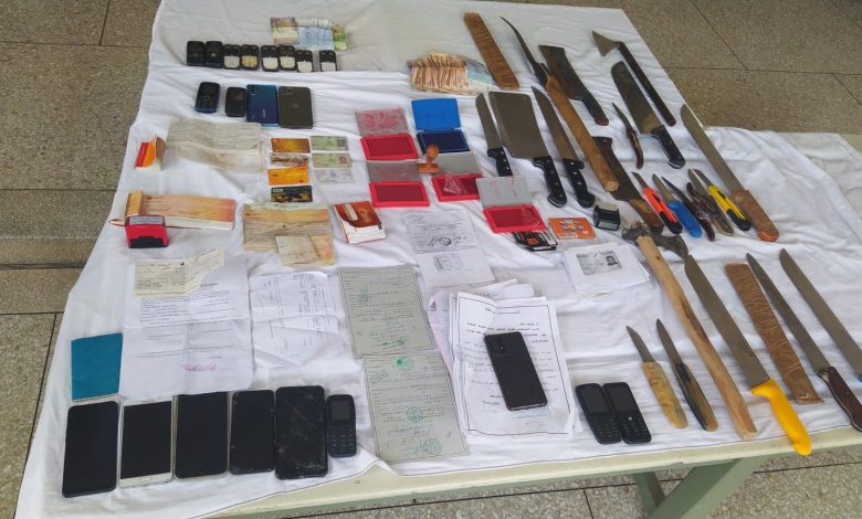 وأضاف المصدر ذاته أن إجراءات التفتيش المنجزة في هذه القضية مكنت من حجز مجموعة كبيرة من الأسلحة البيضاء، من مختلف الأحجام والأشكال، وطوابع إدارية مزيفة، وإيصالات لحوالات مالية، وعقود ووثائق مشكوك في صحتها، ودراجة نارية تحمل وثائق ملكية مزيفة، ومبالغ مالية يشتبه في كونها مرتبطة بعائدات الابتزاز تحت التهديد بالعنف.