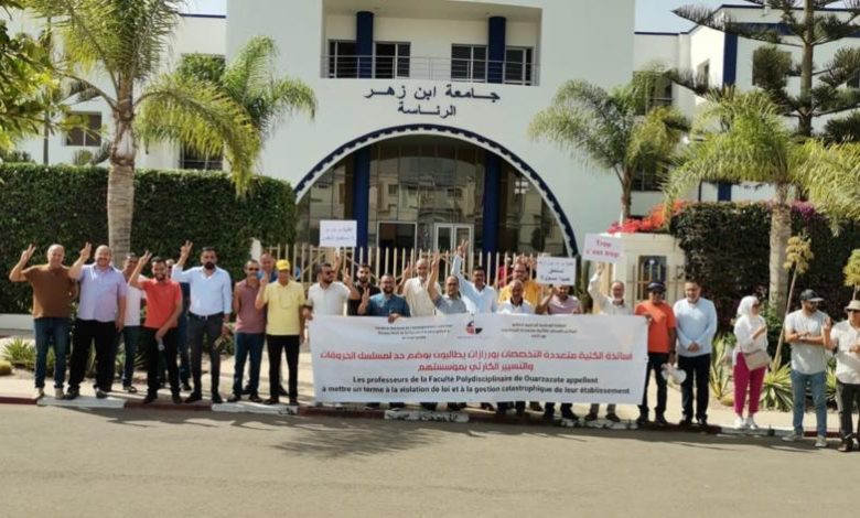 تفعيلا لمخرجات الجمع العام للسيدات والسادة الأساتذة بالكلية متعددة التخصصات المنعقد يوم 01 يونيو 2023 نظم أساتذة الكلية وقفة احتجاجية أمام رئاسة جامعة ابن زهر بأكادير يوم الجمعة 14 يوليوز 2023 على الساعة العاشرة صباحا للتنديد بمسلسل الخروقات الذي تعيشه الكلية منذ ما يزيد على أربع سنوات والمطالبة بوضع حد للتسيير الكارثي والمزاجي بمؤسستهم من طرف العميد المنتهية ولايته.
