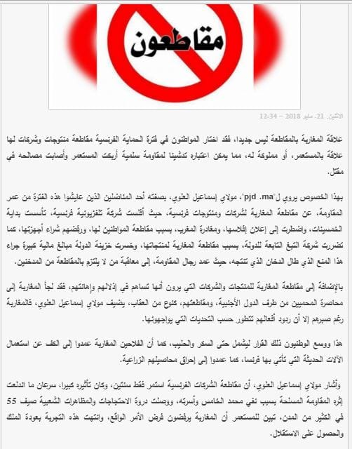 ونشرت البوابة الحزبية مقالة معززة بتصريح لقيادي سابق بحزب “التقدم والاشتراكية”، هو ملاي اسماعيل العلوي، اعتبرت فيه أن “حملة المقاطعة التي يقودها المغاربة حالياً، تشبه الى حد كبير حملة مقاطعة المغاربة خلال فترة الحماية للمُستعمر، بينها مقاطعة “طابا” التي تستعمل لصناعة السجائر ومقاطعة استعمال الألات الميكانيكية التي يستوردها المستعمر الفرنسي.