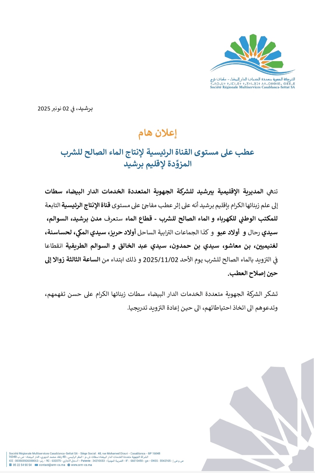 تنهي المديرية الإقليمية ببرشيد، للشركة الجهوية المتعددة الخدمات الدار البيضاء – سطات، إلى علم زبنائها الكرام بإقليم برشيد، أنه على إثر عطب مفاجئ على مستوى قناة الإنتاج الرئيسية التابعة للمكتب الوطني للكهرباء والماء الصالح للشرب – قطاع الماء، ستعرف مدن برشيد ، السوالم ، سيدي رحال و أولاد عبو و كذا الجماعات الترابية الساحل أولاد حريز، سيدي المكي، لحساسنة لغنيميين ، بن معاشو ، سيدي بن حمدون ، سيدي عبد الخالق و السوالم الطريفية، إنقطاعا في التزويد بالماء الصالح للشرب يوم الأحد 2025/11/02 وذلك إبتداء من الساعة الثالثة زوالا إلى حين إصلاح العطب .
