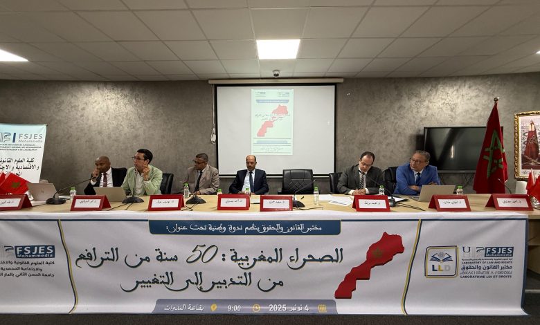 نظم مختبر القانون والحقوق بكلية العلوم القانونية والاقتصادية والاجتماعية بالمحمدية، التابعة لجامعة الحسن الثاني بالدار البيضاء، يوم الثلاثاء 4 نونبر 2025 بقاعة الندوات، ندوة وطنية تحت عنوان “الصحراء المغربية: 50 سنة من الترافع من التدبير إلى التغيير”، وقد تميزت الندوة بحضور الأساتذة والباحثين المتخصصين والطلبة.