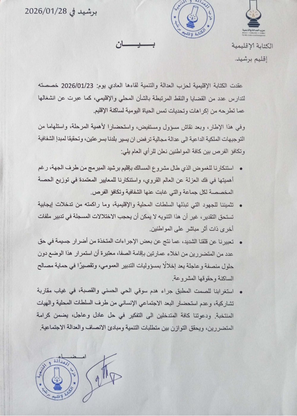 أصدرت الكتابة الإقليمية لحزب العدالة والتنمية، نهاية شهر يناير 2026 بيانا للرأي العام بإقليم برشيد، بعدما كانت قد عقدت لقاءها العادي يوم 2026/01/23، الذي خصصته لتدارس عدد من القضايا والنقط المرتبطة بالشأن المحلي والإقليمي، كما عبرت عن إنشغالها عما تطرحه من إكراهات وتحديات تمس الحياة اليومية لساكنة الإقليم .