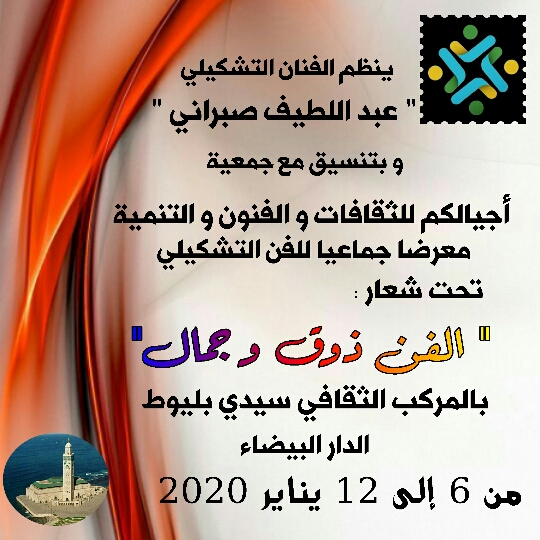 يحتضن المركب الثقافي سيدي بليوط بمدينة الدار البيضاء من 6 إلى 12 يناير 2020، معرضا للفن التشكيلي تحت شعار” الفن ذوق وجمال” ويشارك في هذا المعرض المنظم من طرف الفنان التشكيلي عبد اللطيف صبراني، بتنسيق مع جمعية أجيالكم للثقافات والفنون والتنمية، نخبة من أهم فناني الحركة التشكيلية المغربية المعاصرة، وينتمي الفنانون المشاركون إلى أجيال متعددة ومدارس فنية مختلفة، ويقدمون مجموعة من الأعمال الفنية المميزة في مجالات الرسم والتصوير وغيرها .