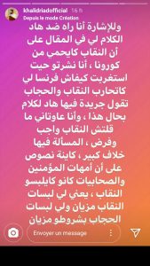 وزاد قائلا: وللإشارة أنا راه ضد هدا الكلام لي في المقال على أن النقاب كايحمي من “كورونا”، مضيفا، “أنا نشرتو حيت استغربت كيفاش فرنسا لي كتحارب النقاب والحجاب تقول جريدة فيها هاد الكلام بحال هذا، وأنا عاوتاني ما قلتش النقاب واجب وفرض، المسألة فيها خلاف كبير، كاينة نصوص على أن أمهات المؤمنين والصحابيات كانو كايلبسو النقاب، يعني لي لبسات النقاب مزيان ولي لبسات الحجاب بشروطو مزيان”.