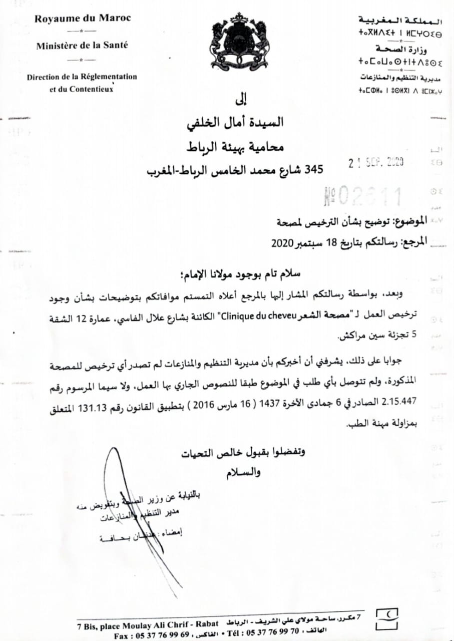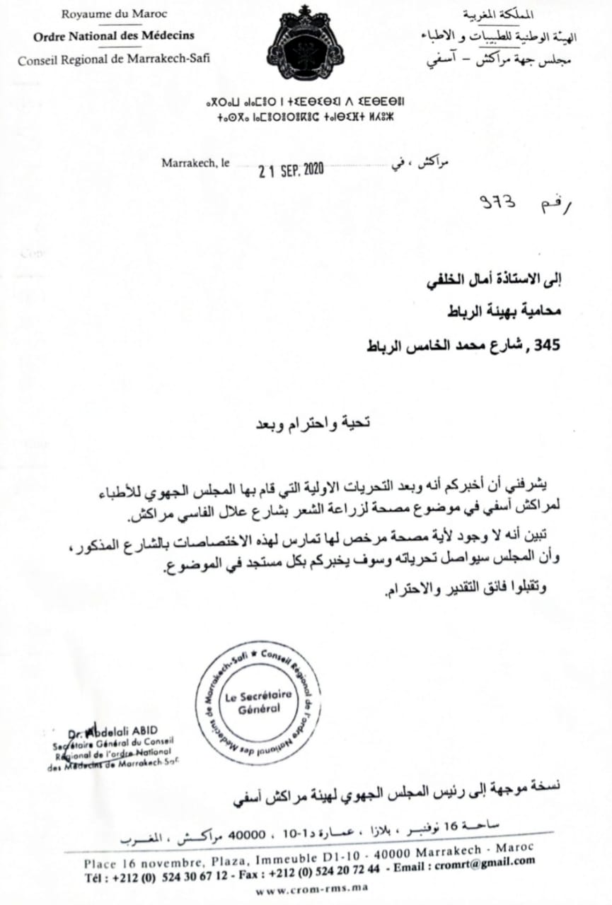 وفي نفس التاريخ وتحت رقم 973 توصل دفاع ناصرالدين زيان برسالة من الهيئة الوطنية للطبيبات والأطبWXsssاء موقعة من طرف الكاتب العام لمجلس جهة مراكش-آسفي، شدد فيها على عدم وجود أية مصحة خاصة مرخص لها بممارسة اختصاص زراعة الشعر بمراكش.