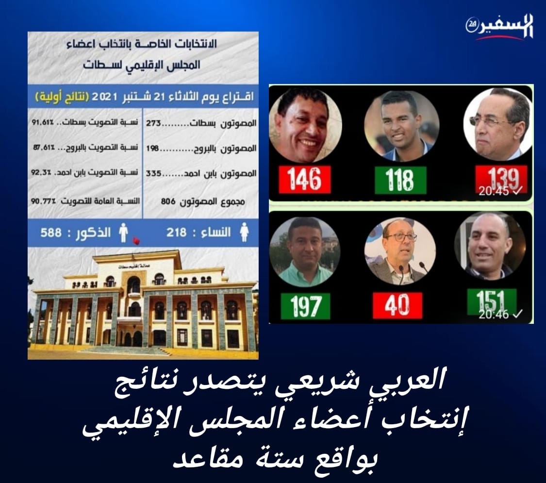 السفير 24 – هشام العمراوي تصدر العربي الشريعي وكيل لائحة حزب الاستقلال نتائج انتخابات المجلس الاقليمي بسطات التي أجريت اليوم…