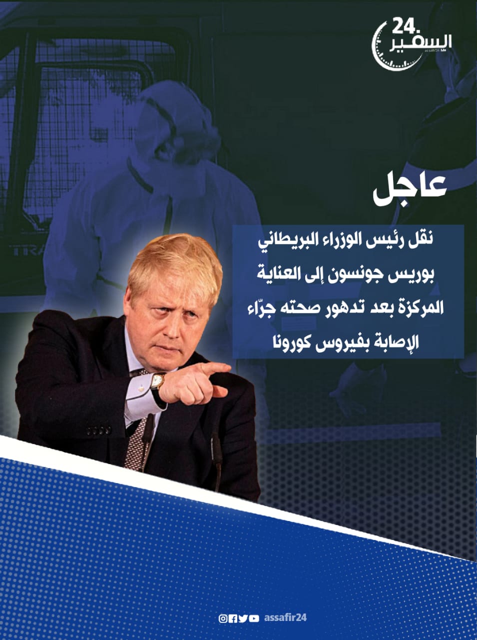 السفير 24 – سكينة عبداللوي نقل رئيس الوزراء البريطاني، بوريس جونسون، مساء اليوم الاثنين، إلى العناية المركزة بعد يوم من…