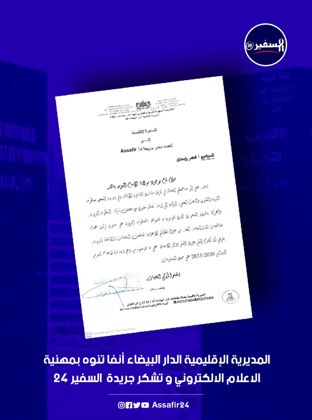السفير 24 وجهت المديرية الإقليمية للتربية و التكوين و البحث العلمي الدار البيضاء أنفا، ممثلة في مديرتها السيدة بشرى أعرف…